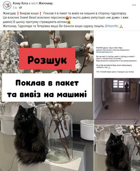 «Живодер! Викрав кицю! Поклав її в пакет та вивіз на машині в сторону гідропарку», – йдеться у дописі.
