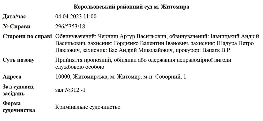 «Призначити підготовче судове засідання по кримінальному провадженні за обвинуваченням ОСОБА_2 у вчиненні кримінального правопорушення, передбаченого ч.3 ст.368 КК України та ОСОБА_3 у вчиненні кримінального правопорушення, передбаченого ч.5 ст.27, ч.3 ст.368 КК України на 11 год 00 хв 04 квітня 2023 року у залі №312-1 Корольовського районного суду м. Житомира, за адресою: м.Житомир, м-н Соборний, 1», - зазначається в ухвалі.
