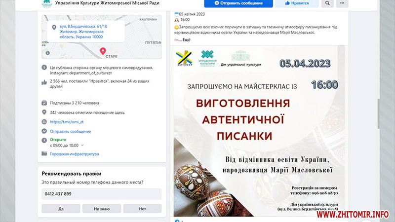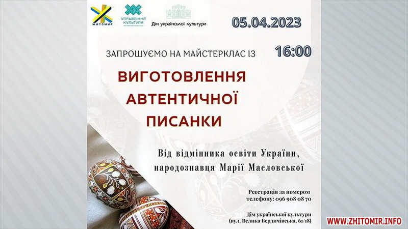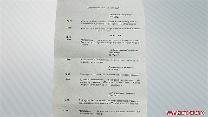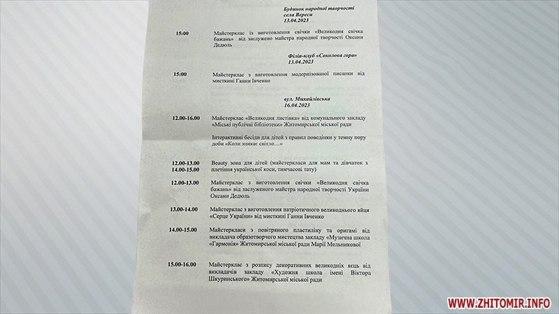 «В рамках організації привітань з Великоднем планується в період з 5 квітня по 16 квітня у підвідомчих закладах провести майстер-класи та тематичні виставки, в усіх заклад культури, враховуючи філії «Соколова гора», «Дім української культури», «Будинок народної творчості с. Вереси». Загалом планується провести 40 майстер-класів та залучити 700 дітей», - розповідає начальниця управління культури Житомирської міської ради Ілона Колодій.