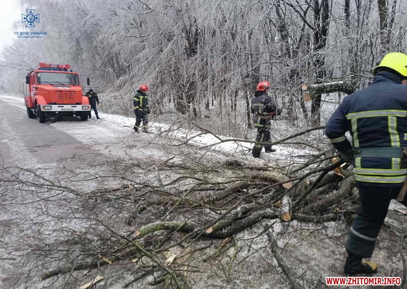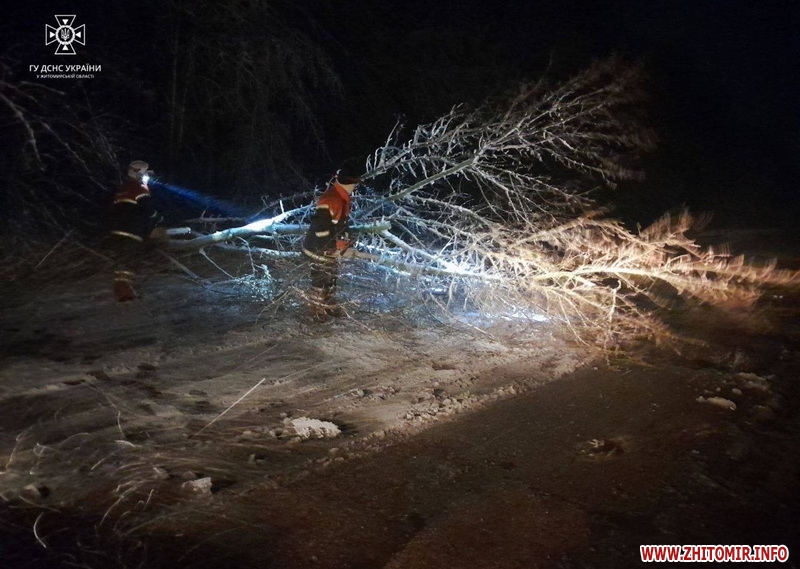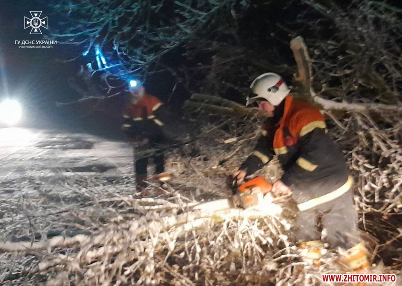 «5 квітня о 00:49 до Служби порятунку “101” надійшло повідомлення про те, що поблизу с. Волиця Житомирського району на автодорогу повалилися дерева, які перекрили рух транспортним засобам. Про це рятувальників сповістили водії, які не могли проїхати повз перешкоди. По прибуттю бійців ДСНС з'ясувалося, що на відрізку автошляху Житомир-Сквира протяжністю 3 км, через ускладнення погодних умов впали два клени. Стовбури та гілки перекрили рух по всій проїжджій частині. Рятувальники порізали бензопилами повалені дерева та прибрали рештки на узбіччя дороги. Вже серед ночі рух транспортних засобів було відновлено в обох напрямках. Вранці пожежно-рятувальні підрозділи розблокували ще одну дорогу від повалених дерев. Поблизу с. Зоряне на автошляху Бердичів-Іллінці внаслідок падіння дерев утворився затор із автомобілів. В заторі опинився і шкільний автобус, який підвозив дітей із сіл Зоряне та Городок Ружинської громади Бердичівського району», - йдеться в повідомленні.