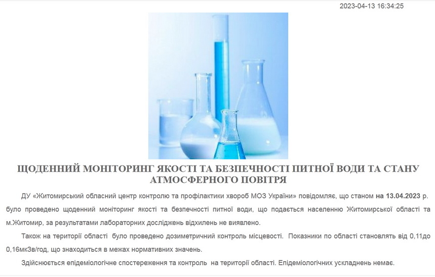 Зауважимо, що ОЦКПХ постійно публікує результати моніторингу якості питної води та стану атмосферного повітря зазначаючи «за результатами лабораторних досліджень відхилень не виявлено».