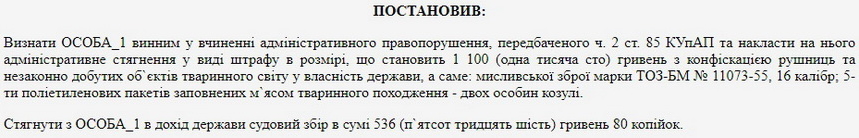 Тож суд постановив визнати чоловіка винним у вчиненні адмінправопорушення та накласти на нього «стягнення у виді штрафу в розмірі, що становить 1 100 (одна тисяча сто) гривень з конфіскацією рушниць та незаконно добутих об`єктів тваринного світу у власність держави, а саме: мисливської зброї марки ТОЗ-БМ № 11073-55, 16 калібр; 5-ти поліетиленових пакетів, заповнених м`ясом тваринного походження – двох особин козулі».