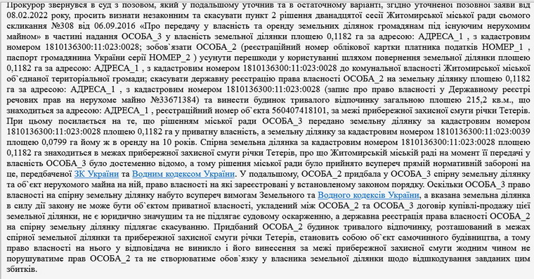 У позові, з яким прокурор звернувся до Богунського районного суду м.Житомира на початку лютого 2022 року, містилися такі вимоги: визнання незаконним та скасування рішення Житомирської міської ради; зобов`язання усунути перешкоди у використанні шляхом повернення земельної ділянки; скасування державної реєстрації права власності на ділянку; винесення споруди, яка є об`єктом самочинного будівництва, за межі прибережної захисної смуги.