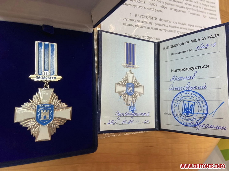 «Нагородити відзнакою «За заслуги перед містом Житомиром ІІІ ступеня» за активну громадську позицію, самовіддану і плідну працю на благо нашого міста та надання матеріальної і духовної допомоги Ольшевського Ярослава – настоятеля Парафіяльної ради Парафії «Божого Милосердя» Римської Католицької церкви м. Житомир», – йдеться у розпорядженні міського голови, підписаному 14 квітня 2023 року.