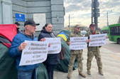Написи на плакатах, які тримають люди, – відповідного змісту: «Московський піп в українській рясі вбиває ворожим словом не гірше, ніж куля окупанта», «Сергій Іванович, відпустіть вже той руSSкій корабель» тощо.