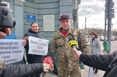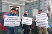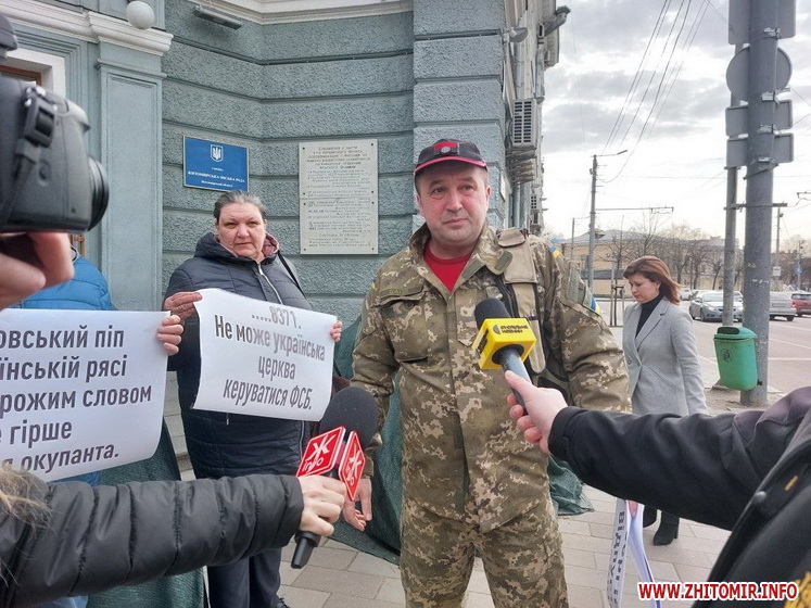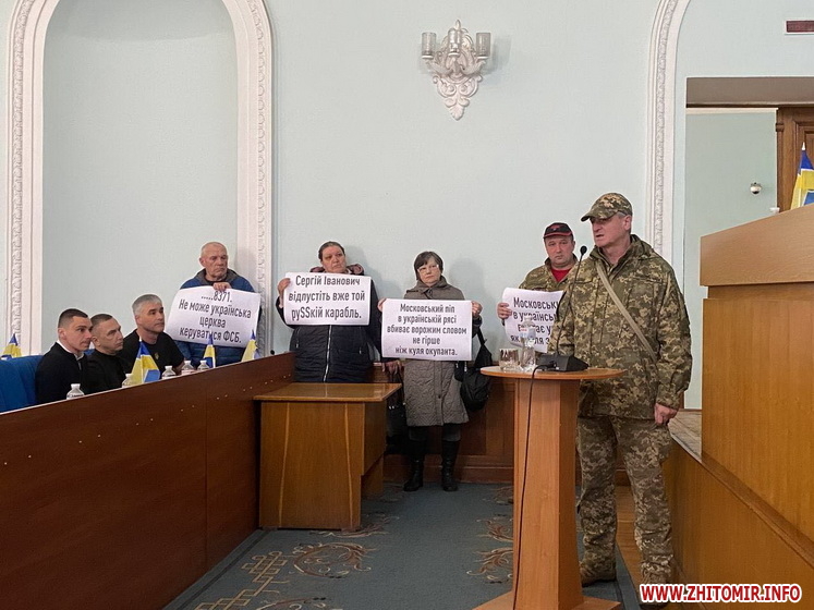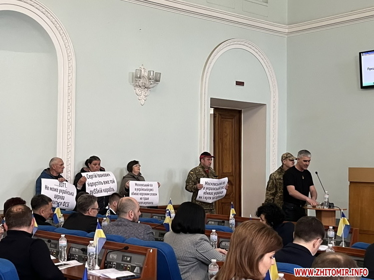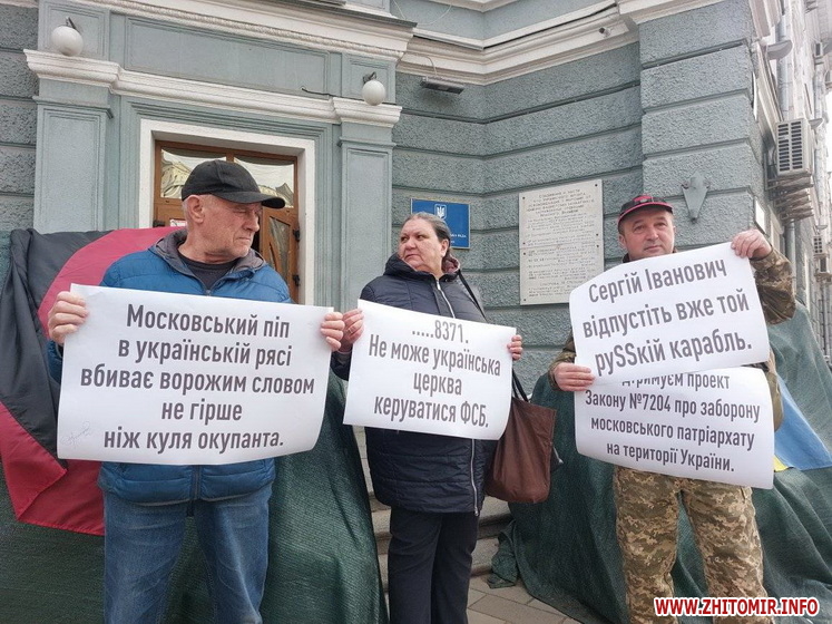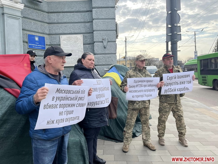 Уранці 21 квітня біля будівлі Житомирської міської ради, де сьогодні проходить сесія, зібралося кілька містян з плакатами. Люди кажуть, що потрібно заборонити московський патріархат, бо нам треба позбутися всього російського.