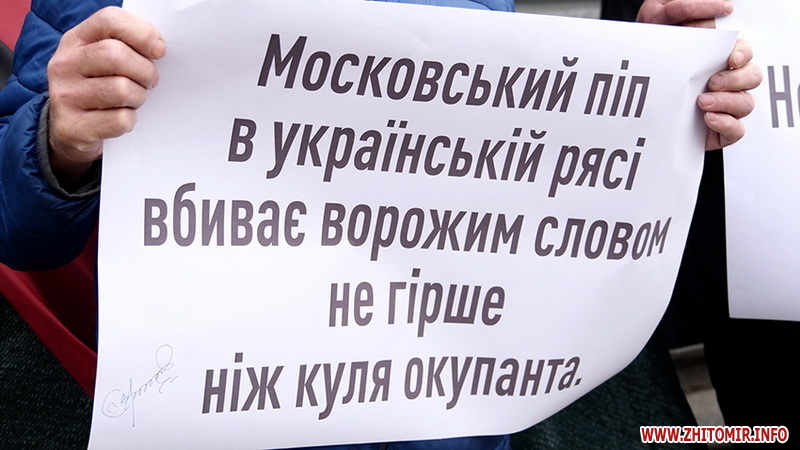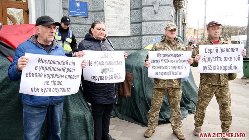 Вранці 21 квітня біля будівлі Житомирської міської ради, де сьогодні проходить сесія, зібралося кілька містян з плакатами щодо заборони московського патріархату.