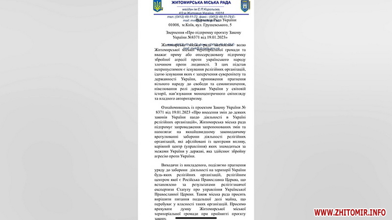 «Поділяємо прагнення уряду до заборони діяльності на території України будь-яких релігійних організацій, релігійним центром якої є Російська Православна Церква, що встановлено за результатами релігієзнавчої експертизи Статуту про управління Української Православної Церкви. Також міська рада просить вирішити питання подальшої долі майна, що перебуває у власності таких організацій. Просимо врахувати думку Житомирської міської територіальної громади при прийнятті проєкту закону», – зачитує текст звернення секретар Житомирської міської ради Віктор Клімінський.