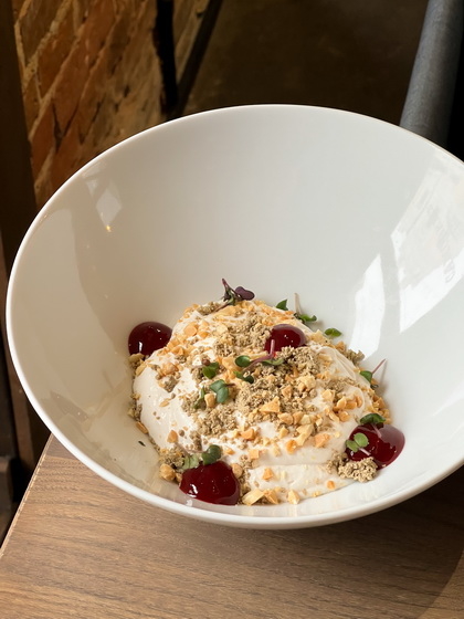 Повітряний мус на основі курятини та вершків викладається на тарілку і доповнюється ягідним гелем та мікрогріном. Окремо подається свіжоспечена піта, халва і солоний грильяж, які можна додавати у пате за смаком.