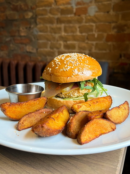 Хрусткий сир камамбер обсмажується у паніровці «Панко» і викладається на молочну булочку власного випікання. Туди ж додається томатна сальса, листя руколи та айсбергу, маринована груша та ягідний гель. Сендвіч подається з огірками власного маринування, соусом айолі та скибками запеченої картоплі із додаванням паприки.