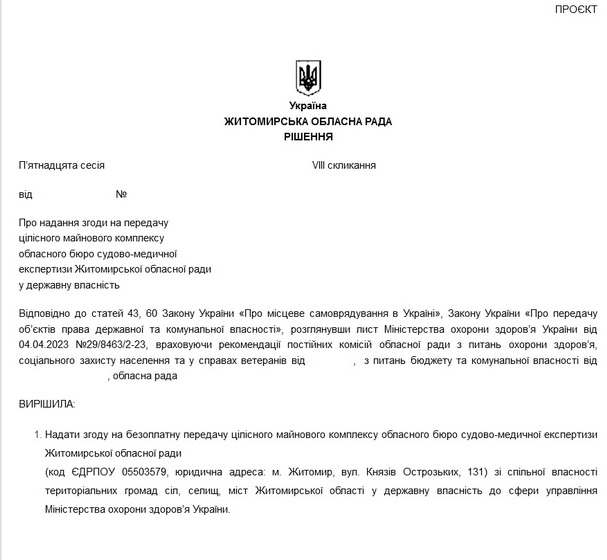 Також на сайті облради 21 квітня оприлюднений проєкт рішення сесії про безоплатну передачу в державну власність розташованого в Житомирі на вул. Князів Острозьких цілісного майнового комплексу обласного бюро судово-медичної експертизи Житомирської обласної ради. З відповідним листом до облради 4 квітня звернулося Міністерство охорони здоров’я.