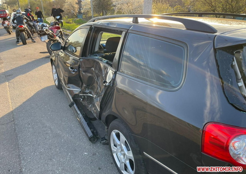 «Зіткнення двоколісника та автомобіля сталося 23 квітня близько 16:45 на Київському шосе в обласному центрі. Попередньо, водій мотоцикла «Yamaha», 28-річний житомирянин, рухаючись вулицею міста, допустив зіткнення з автомобілем «Volkswagen Passat» під керуванням 23-річного місцевого жителя.