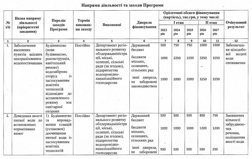«Метою Програми е забезпечення гарантованих Конституцією України прав громадян на достатній життєвий рівень та екологічну безпеку шляхом забезпечення якісною питною водою в необхідних обсягах та відповідно до встановлених нормативів щодо якості питної води, забезпечення розвитку та реконструкції систем централізованого водопостачання та централізованого водовідведення населених пунктів області. Оптимальним шляхом розв’язання проблеми с реалізація державної політики у сфері питної води та питного водопостачання щодо розвитку та реконструкції систем централізованого водопостачання та централізованого водовідведення; доведення якості питної води до нормативних вимог, забезпечення населених пунктів якісним, безпечним для здоров’я людини централізованим водопостачанням, зокрема шляхом переходу до водопостачання із підземних джерел», - йдеться у програмі.
