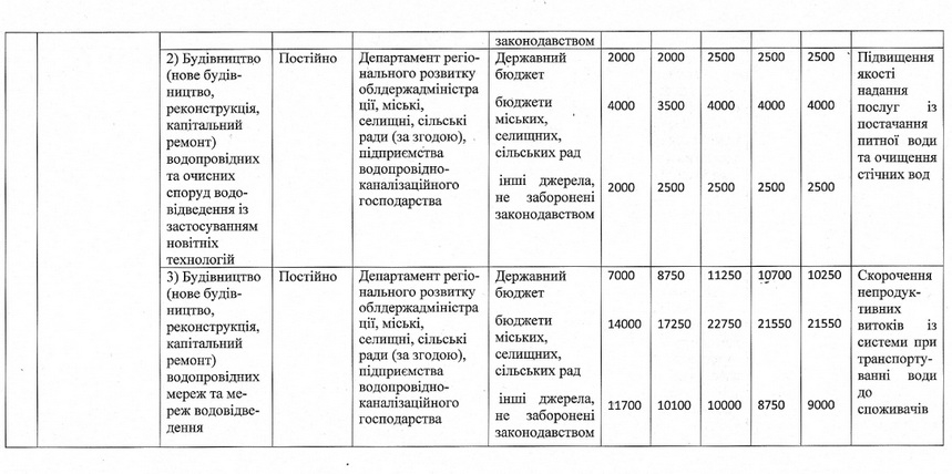 будівництво (нове будівництво, реконструкція, капітальний ремонт) водопровідних та очисних споруд водовідведення із застосуванням новітніх технологій;