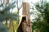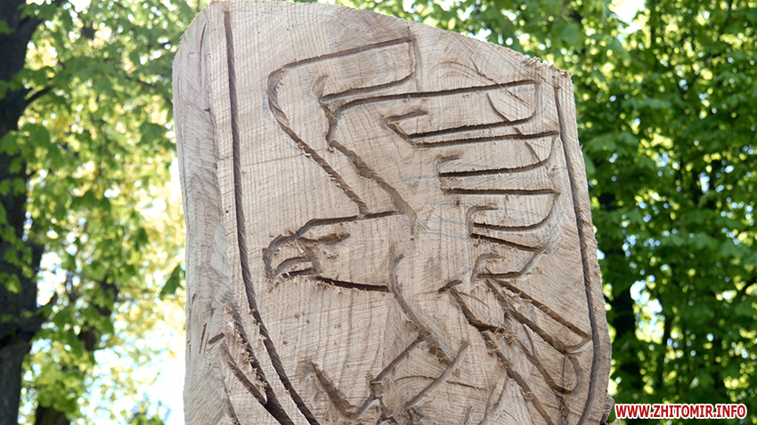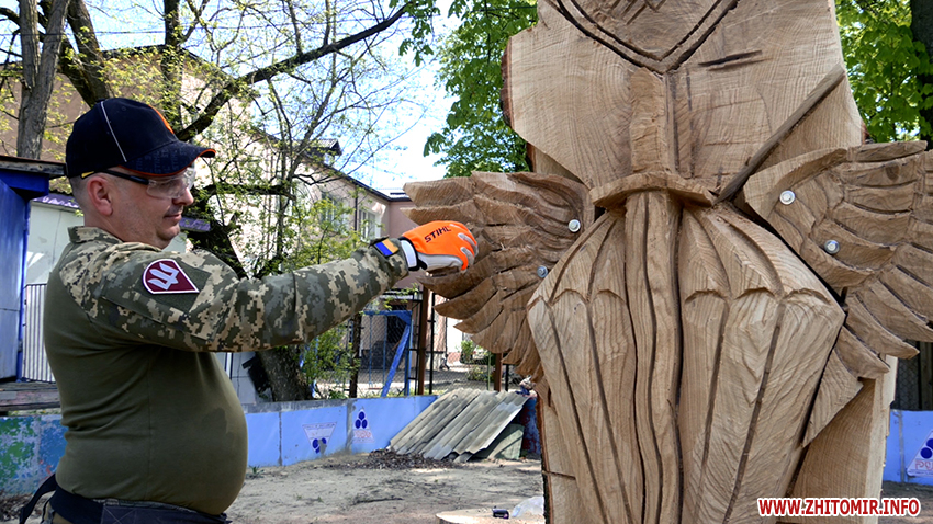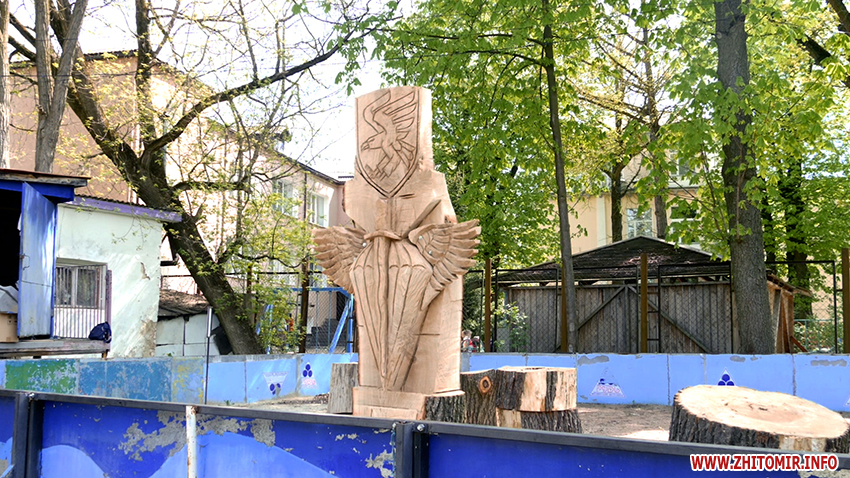 «По плану все мало бути із суцільного дерева. Було використано повалене дерево, тому виходили з того, що є. З відходів зроблені крила, все інше буде з цілої частини. Знизу знак повітряно-десантних військ України, зверху знак 95-ї бригади – орел, який ширяє у небі, падає на здобич, як сила, що знищує ворога. Позаду буде голуб, який злітає з вирви після вибуху снаряда танку, балістичної ракети, просто вирва після вибуху. Він символізуватиме душу людини, душу воїна, душу цивільної людини, яка віддала своє життя для захисту своєї батьківщини», - розповідає скульптор Іван Халус.