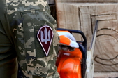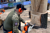 Воїн-десантник з 95-ї бригади працює над скульптурою з дерева, яку створює в пам’ять про своїх побратимів.