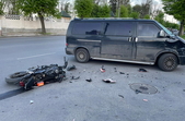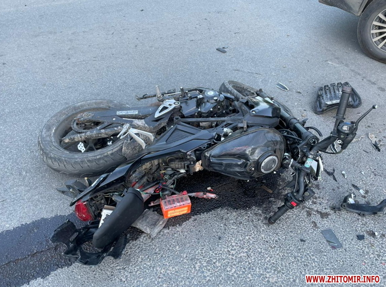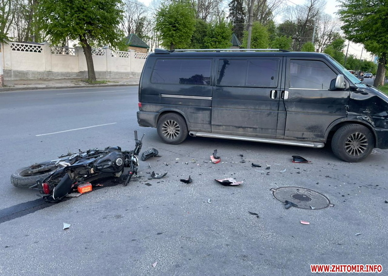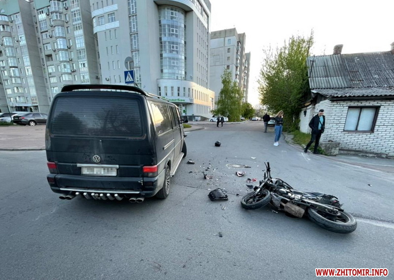 «Дорожньо-транспортна пригода сталася увечері 5 травня на перехресті вул. Перемоги та пров. Червоного. Попередньо, водій автомобіля «Volkswagen Transporter», 68-річний житель м. Житомира, виконуючи маневр повороту, допустив зіткнення з мотоциклом «Kovi» під керуванням 15-річного житомирянина. У результаті зіткнення травми отримав мотоцикліст. Його ушпиталили до травматологічного відділення обласної дитячої лікарні.