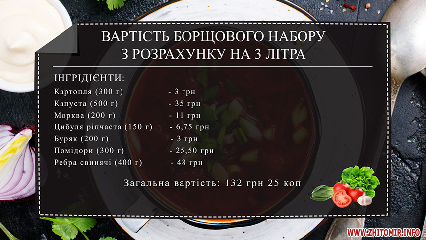 Вартість моркви на місцевому базарі тримається у межах 55 грн, ріпчаста цибуля від 45 до 60 грн/кг. Не обійтися без головного інгредієнту страви – червоного буряку, за нього просять 15 грн/кг. Вартість домашніх буряків пані Люба вимірює по-своєму.