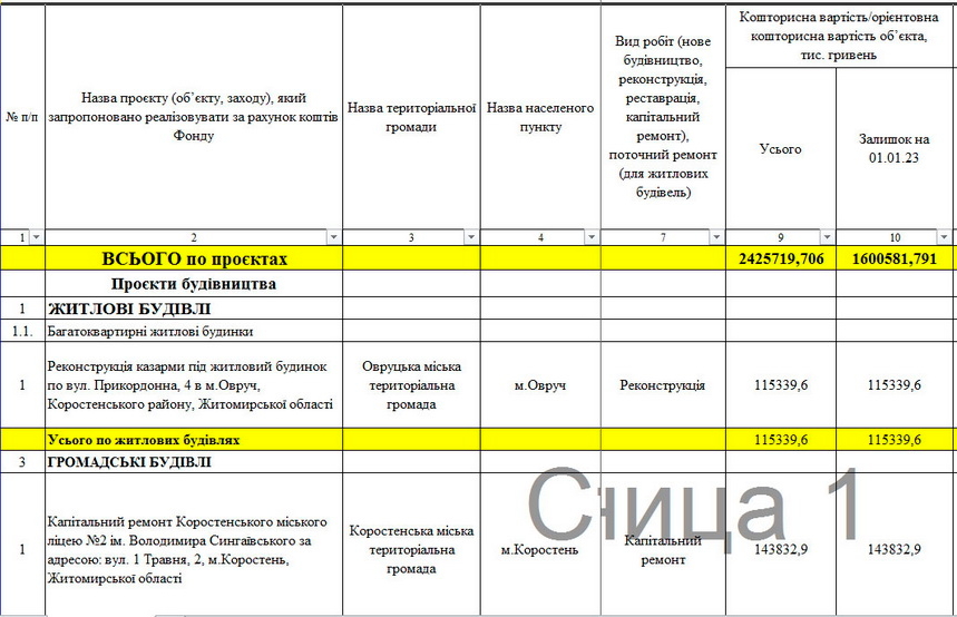 В категорії «Житлові будівлі» є лише один об’єкт: реконструкція казарми в Овручі під житловий будинок на 36 квартир, вартість – 115 млн 339,6 тис. грн.