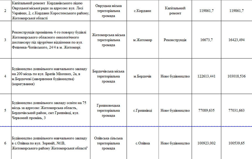 Зокрема, Житомирська ОВА пропонує за кошти фонду ліквідації наслідків збройної агресії побудувати дитсадок в селі Оліївка Житомирського району вартістю 100 млн 923 тис. 002 грн. Також є проєкт по будівництву дитсадка в Бердичеві, яке розпочали ще в 2012 році, його вартість 122 млн 613 тис. 441 грн. Фінансуванням з держбюджету цього будівництва переймається народний депутат від Бердичівського округу Богдан Кицак. Ще один дитсадок планують побудувати в смт Гришківці Бердичівського району, вартість цього будівництва – 77 млн 089 тис. 635 грн.