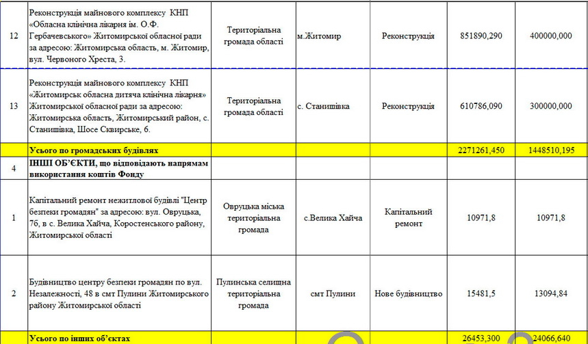 Від Житомирської області в заявці щодо фінансування проєктів за рахунок коштів Фонду є 16 об’єктів, які потребують реконструкції чи капітального будівництва, і п’ять пропозицій щодо розроблення проєктної документації. Орієнтовна кошторисна вартість усіх об’єктів – 2 млрд 425 млн 719 тис. 706 грн. З коштів фонду ліквідації в 2023 році хотіли отримати 1 млрд 338 млн 976 тис. 278 грн. Замовником робіт по всіх об’єктах буде Житомирська ОВА.