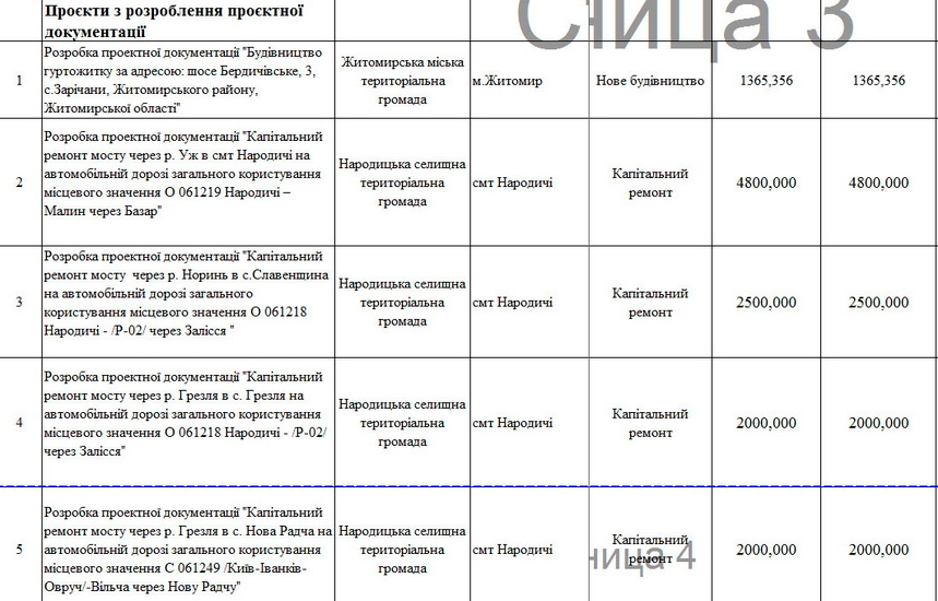 Проєктну документацію хочуть зробити на капітальний ремонт чотирьох мостів в Народицькій громаді та будівництво гуртожитку для ВПО в Зарічанах.