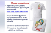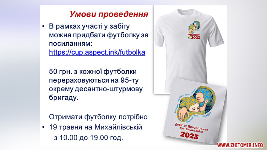 «Можна буде придбати тематичну футболку, яка розроблена саме до цього дня, з логотипом Всесвітнього дня вишиванки. Її можна буде придбати за посиланням в реєстраційній формі. Футболка буде коштувати 320 грн, з них 50 грн буде перераховано на 95 бригаду. Отримати футболку потрібно буде на Михайлівській 19 травня з 10:00 до 19:00 години, щоб 20 травня одягти та побігти», – говорить начальниця управління у справах сім’ї, молоді та спорту Житомирської міської ради.