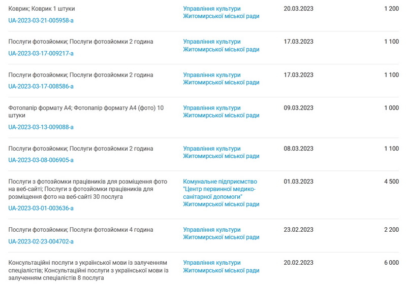 А ось управління культури Житомирської міської ради вже двічі укладало договори на «Консультаційні послуги з української мови із залученням спеціалістів»: 7 листопада 2022 року – 1 послугу, яка мала надаватися з 7 по 26 листопада 2022 року за 8 тис.грн; 20 лютого 2023 року – 8 послуг за 6 тис. грн, які мали надаватися 11 квітня. В обох випадках код закупівлі «Навчальні семінари», проведені вони за кошти місцевого бюджету.