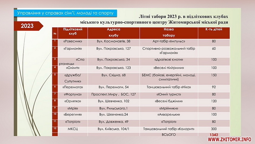 «На базі Міського культурно-спортивного центру також з 12 червня стартують приклубні табори. Вони будуть діяти три місяці (червень, липень, серпень). Кожна зміна триватиме 2 тижні, тобто 5-6 змін у таборах. При 12 підліткових клубах, з денним перебуванням без харчування. Планується залучити 1342 дитини», - розповідає начальниця управління у справах сім’ї, молоді та спорту Житомирської міської ради Ірина Ковальчук.