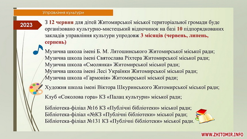 «На базі 10 підпорядкованих закладів управління культури, так само впродовж трьох місяців. Табори діятимуть на базі музичних шкіл: Лятошинського, Святослава Ріхтера, «Смолянка», Лесі Українки, «Гармонії» на базі художньої школи ім. Віктора Шкуринського, клубу «Соколова гора», та трьох бібліотек-філіалів», - зазначила Ірина Ковальчук.