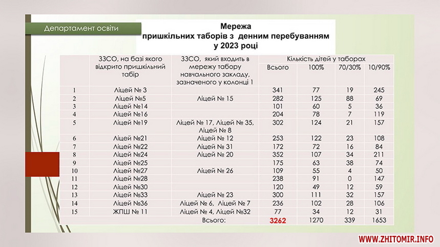 «Департамент освіти починає роботу таборів на базі закладів освіти з 12 червня. Табори діятимуть впродовж 14 робочих днів і працюватимуть на базі 15 закладів освіти. Вони будуть з денним перебуванням та харчуванням. Загалом 3 262 дитини планують оздоровити в таборах при закладах середньої освіти», - розповідає начальниця управління у справах сім’ї, молоді та спорту Житомирської міської ради Ірина Ковальчук.