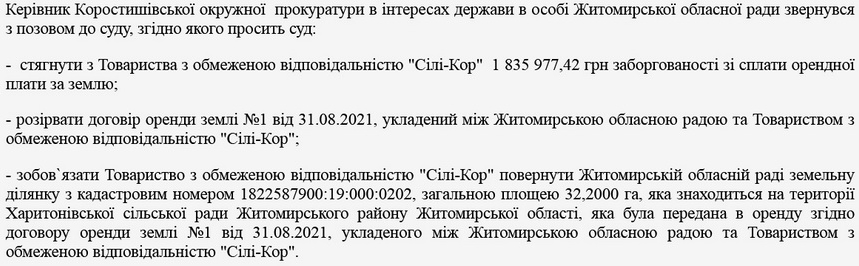 Господарський суд Житомирської області за позовом керівника Коростишівської окружної прокуратури до ТОВ «Сілі-Кор» про стягнення 1,8 млн грн, розірвання договору оренди та повернення земельної ділянки площею 32,2 га.