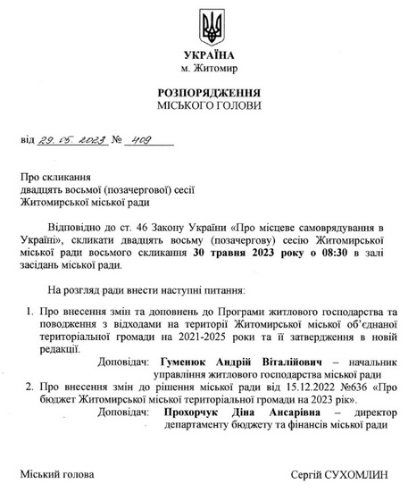Мер Житомира Сергій Сухомлин скликає на 30 травня 2023 року позачергову сесію міської ради: будуть виділяти кошти на відновлення пошкоджень після ворожого удару.
