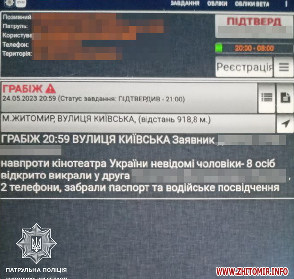У Житомирі патрульні затримали та передали слідчим чоловіка, який повідомив, що його нібито пограбували на Київській, а сам перебував у розшуку за крадіжку.