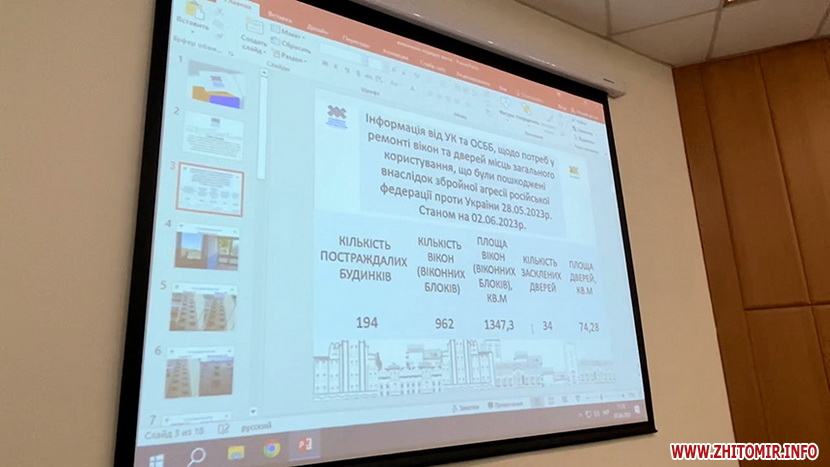У Житомирі на черговому виконкомі 7 червня затвердили порядок ремонту, заміни вікон та дверей у місцях загального користування у житлових будинках, які зазнали пошкоджень внаслідок ворожої атаки «шахедами» наприкінці травня. Як відомо, на це з бюджету міста виділено 5 млн грн. Механізм отримання допомоги роз’яснює начальник управління житлового господарства Андрій Гуменюк.