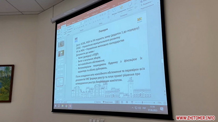 «Витяг – довідка з ЄРДР, витяг із загальних зборів, акт комісійного обстеження, фотоматеріали пошкоджень будинку з фіксацією характеру та обсягу руйнувань. Після складання акту комісійного обстеження та перевірки всіх документів управління ЖКГ формує реєстр та затверджує його виконавчим комітетом», – пояснює начальник управління житлового господарства Житомирської міської ради.