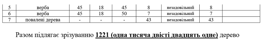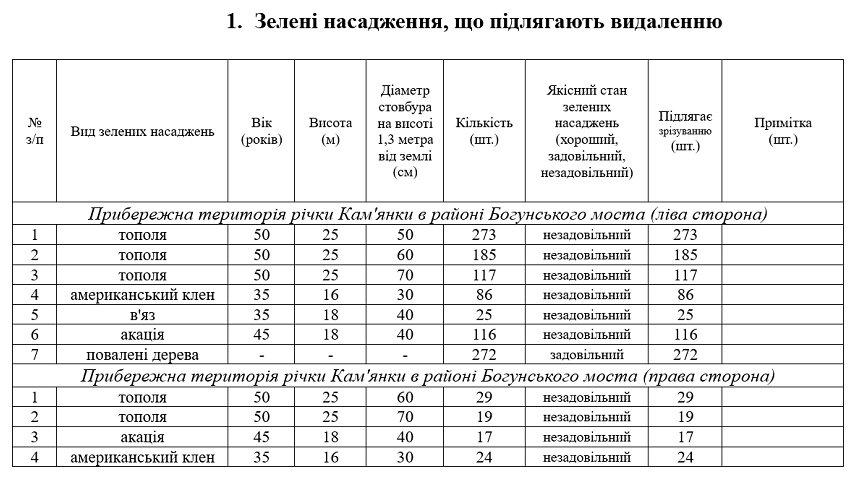 «Комісією з обстеження зелених насаджень на території Житомирської територіальної громади за адресою: прибережна територія річки Кам'янки в районі Богунського моста, виявлено 1221 (одна тисяча двісті двадцять одне) дерево, а саме: 623 (шістсот двадцять три) дерева породи “тополя”, 110 (сто десять) дерев породи “американський клен”, 25 (двадцять п'ять) дерев породи “в'яз”, 133 (сто тридцять три) дерева породи “акація”, 15 (п'ятнадцять) дерев породи “верба”, 315 (триста п'ятнадцять) повалених дерев, які знаходяться в незадовільному та фаутному стані і потребують видалення», – зазначено у додатку.