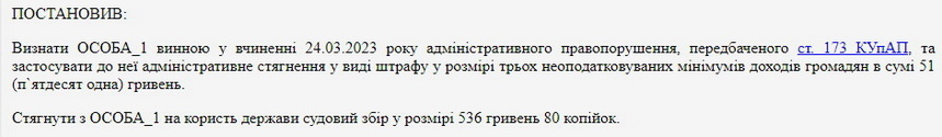Постанову щодо вказаної адміністративної справи (за ст. 173 КУпАП «Дрібне хуліганство») Корольовський районний суд м. Житомира ухвалив 31 травня. В Єдиному державному реєстрі судових рішень постанову оприлюднили 5 червня.
