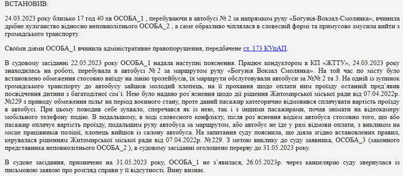 У постанові також сказано, що в судове засідання, призначене на 31.05.2023 року, кондукторка не з`явилася, через канцелярію суду звернулася із письмовою заявою про розгляд справи у її відсутності. Вину визнала.