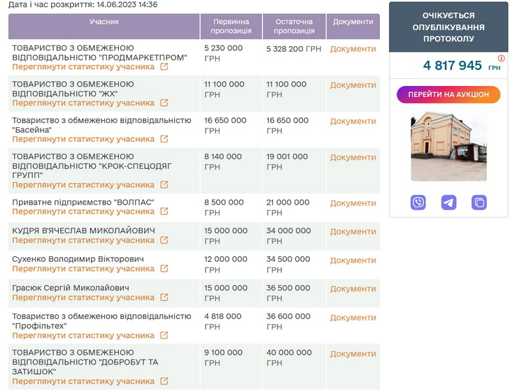 Найбільша стартова пропозиція була у ТОВ «Басейна» - 16 млн 650 тис. грн, під час трьох раундів аукціону суттєво збільшили свої пропозиції лише шестеро і в результаті переможцем стало ТОВ «Добробут та Затишок», яке готове заплатити за майновий комплекс 40 млн грн, що у 8,3 раза більше початкової ціни об’єкта.