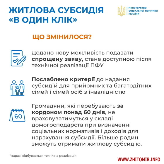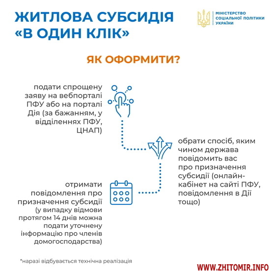 - Українці зможуть подавати спрощені заяви на призначення житлової субсидії «в один клік». Це буде можливо зробити в онлайн-кабінеті на вебпорталі Пенсійного фонду України, мобільному додатку Пенсійного фонду України, на Порталі Дія або - за бажанням - у відділеннях Пенсійного фонду, ЦНАПів і тд.