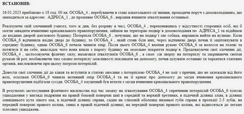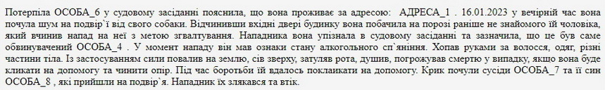 Чергове правопорушення обвинувачений скоїв 16 січня 2023 року. Чоловік, перебуваючи у стані алкогольного сп’яніння, зайшов до чужого двору. Господиня обійстя, почувши гавкіт собаки, вийшла надвір. Непроханий гість заштовхав жінку всередину будинку. Потім із застосуванням сили та погрозами намагався зґвалтувати. Жінка чинила опір та кричала. Тож на гамір прибігли сусіди. Це завадило чоловікові реалізувати свій намір – йому довелося втекти.