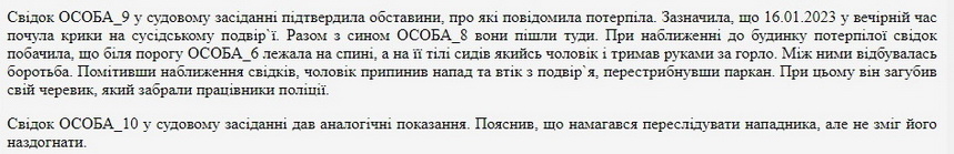 Свідок, сусідка потерпілої, зокрема, розповіла, що обвинувачений, втікаючи, перестрибнув через паркан. При цьому загубив черевик. Інший свідок додав, що намагався наздогнати нападника, але той устиг накивати п’ятами.