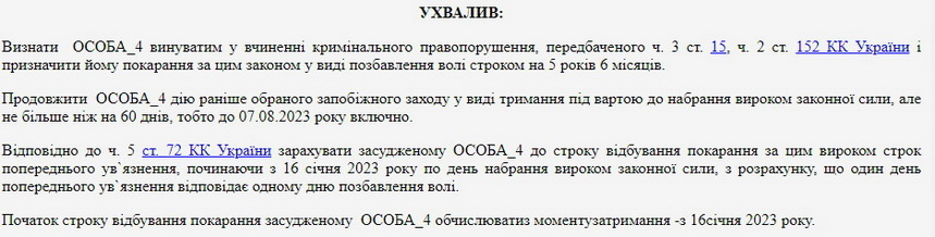 Врешті, суд ухвалив визнати чоловіка винуватим у вчиненні кримінального правопорушення і призначити йому покарання у виді позбавлення волі строком на 5 років 6 місяців.