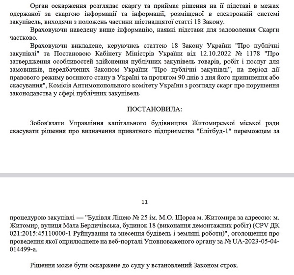 Переможцем було визнано «Елітбуд-1», але на це рішення київське підприємство «Євротехнології» 24 травня подало скаргу до Антимонопольного комітету з аргументами, щодо неправомірного рішення замовника торгів про обрання переможця процедури закупівлі ПП «Елітбуд-1». Антимонопольний комітет прийняв скаргу до розгляду і 5 червня оприлюднив своє рішення: зобов'язати УКБ скасувати рішення про визначення приватного підприємства «Елітбуд-1» переможцем за процедурою закупівлі – «Будівля Ліцею № 25 ім. М.О. Щорса м. Житомира за адресою: м.Житомир, вулиця Мала Бердичівська, будинок 18 (виконання демонтажних робіт)».