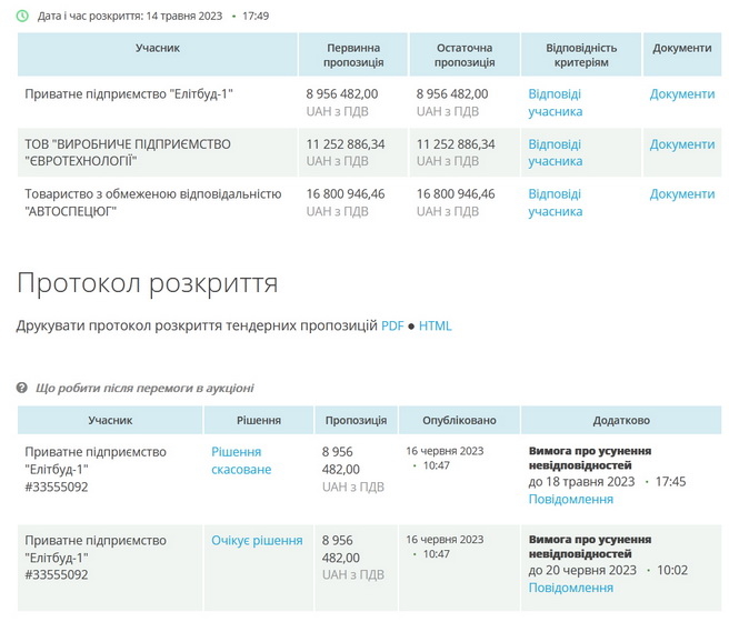 Але управління капітального будівництва перемогу «Елітбуд-1» не скасувало, а висунуло підприємству вимогу про «усунення невідповідностей» до 20 червня 2023 року.
