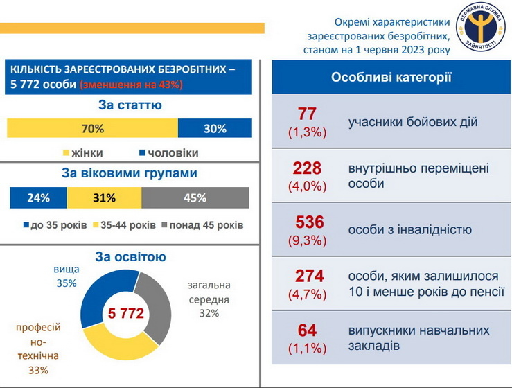 Станом на 1 червня 2023 року кількість зареєстрованих безробітних у Житомирській області становила 5772 особи. Переважна більшість із них – жінки (70%).