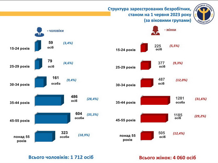 Цікаво, що серед жінок найбільше безробітних у віці 34-44 роки (1281 особа з 4060, тобто 31,6%), а серед чоловіків – у віковій категорії 45-55 років (604 особи з 1712, тобто 35,3%).