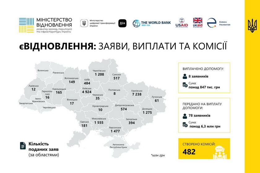 Від 10 травня, з моменту запуску програми єВідновлення, подано 20 308 заяв, найбільше надійшло з Харківської (7 238), Київської (4 924), Миколаївської (1 555), Херсонської (1 477) та Донецької (1 275) областей.