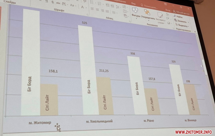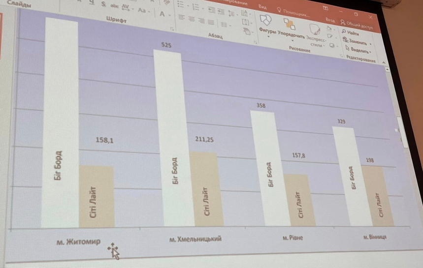 Вона показала порівняння плати за тимчасове користування місцями розташування рекламних засобів, що перебувають в комунальній власності, в сусідніх обласних центрах, та озвучила інформацію про ціни:
